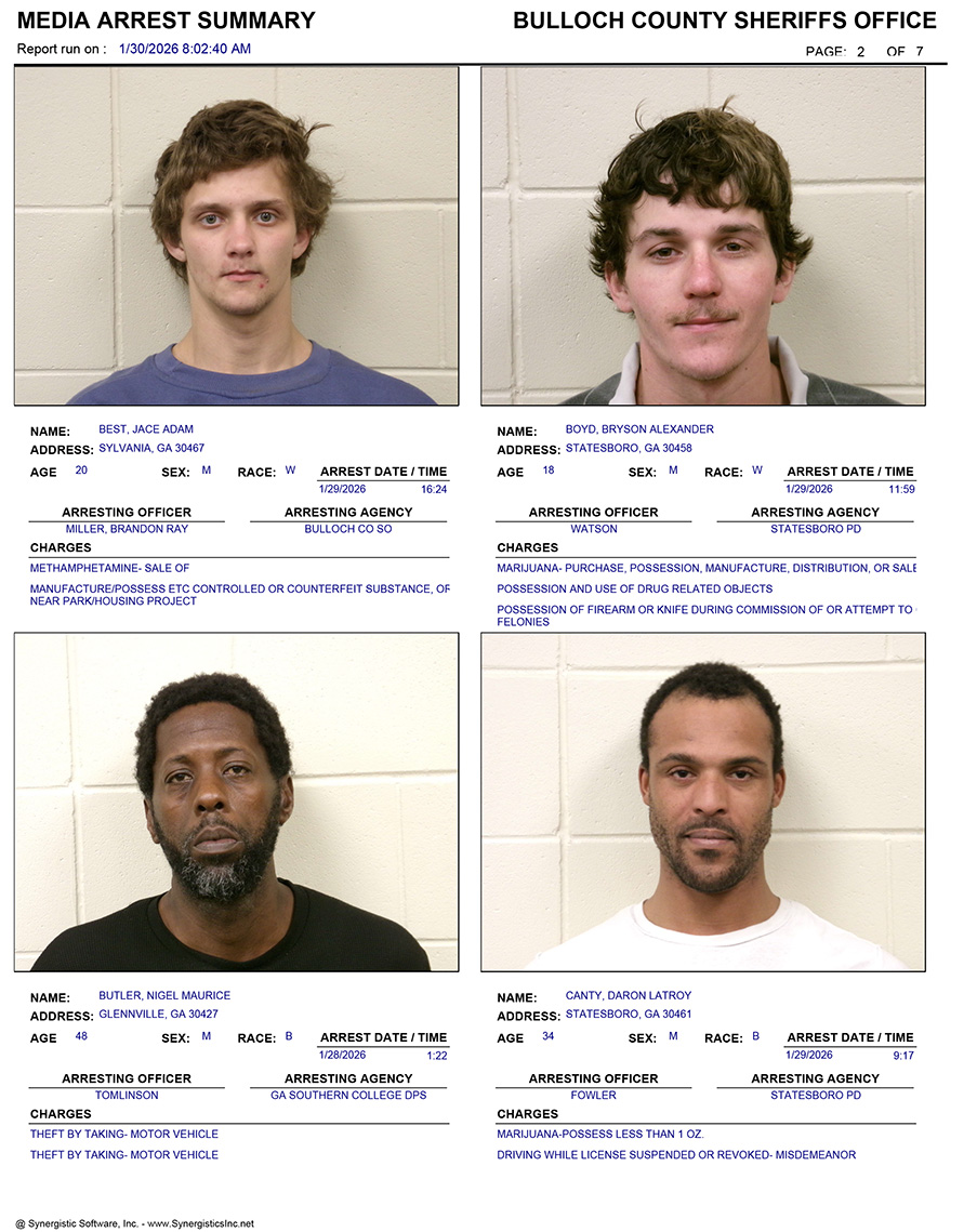 These records are matters of public information provided by the Bulloch County Sheriff’s Office. Booking reports are details of arrests only. All persons below are considered to be innocent unless proven otherwise in a court of law.