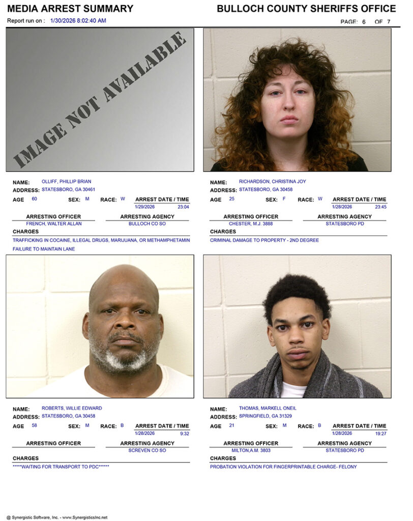 These records are matters of public information provided by the Bulloch County Sheriff’s Office. Booking reports are details of arrests only. All persons below are considered to be innocent unless proven otherwise in a court of law.