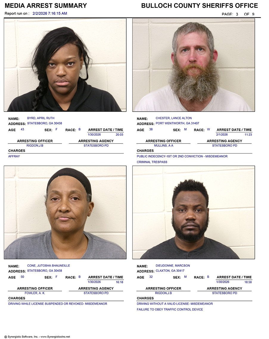 These records are matters of public information provided by the Bulloch County Sheriff’s Office. Booking reports are details of arrests only. All persons below are considered to be innocent unless proven otherwise in a court of law.
