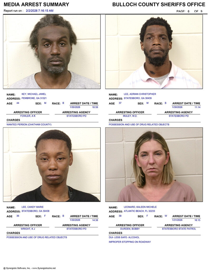 These records are matters of public information provided by the Bulloch County Sheriff’s Office. Booking reports are details of arrests only. All persons below are considered to be innocent unless proven otherwise in a court of law.
