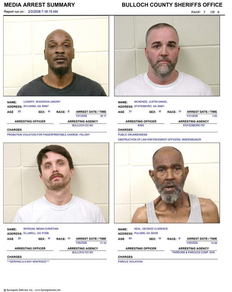 These records are matters of public information provided by the Bulloch County Sheriff’s Office. Booking reports are details of arrests only. All persons below are considered to be innocent unless proven otherwise in a court of law.