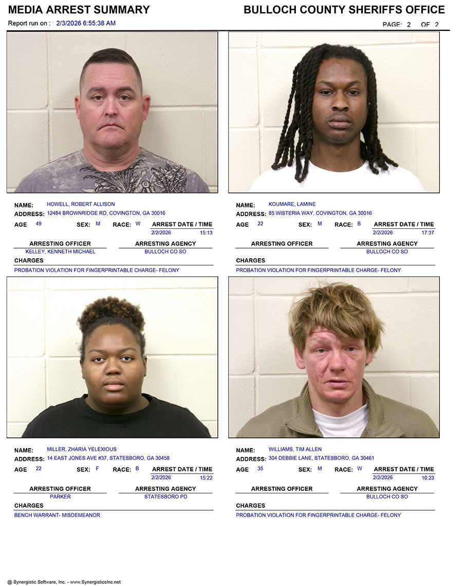 These records are matters of public information provided by the Bulloch County Sheriff’s Office. Booking reports are details of arrests only. All persons below are considered to be innocent unless proven otherwise in a court of law.