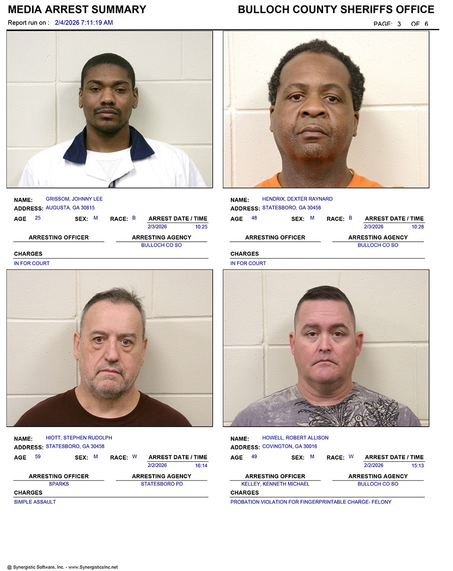 These records are matters of public information provided by the Bulloch County Sheriff’s Office. Booking reports are details of arrests only. All persons below are considered to be innocent unless proven otherwise in a court of law.