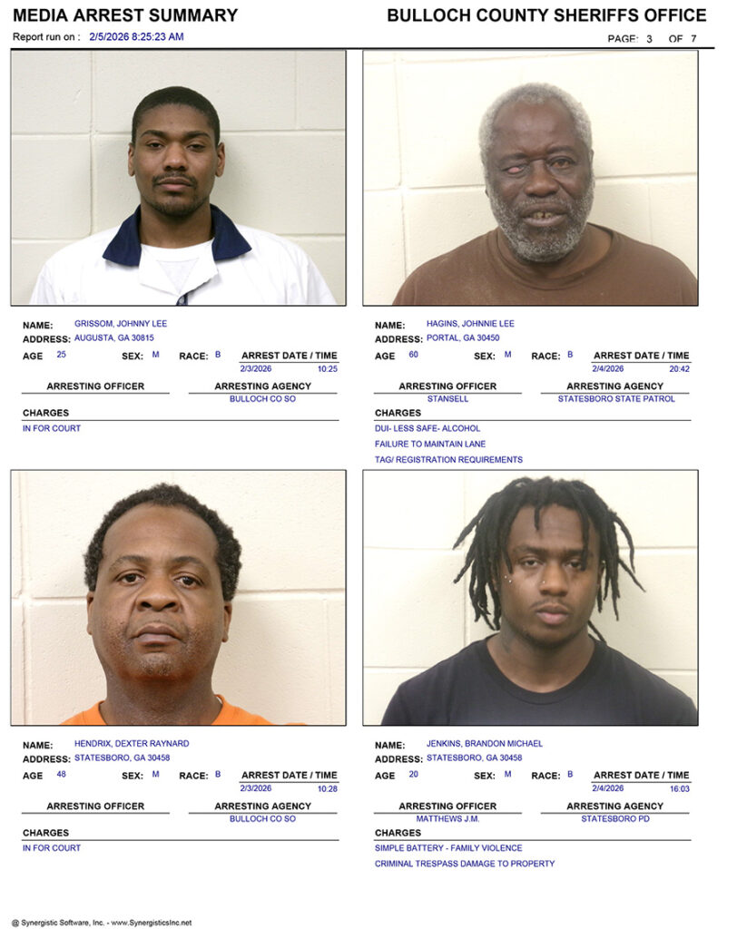 These records are matters of public information provided by the Bulloch County Sheriff’s Office. Booking reports are details of arrests only. All persons below are considered to be innocent unless proven otherwise in a court of law.
