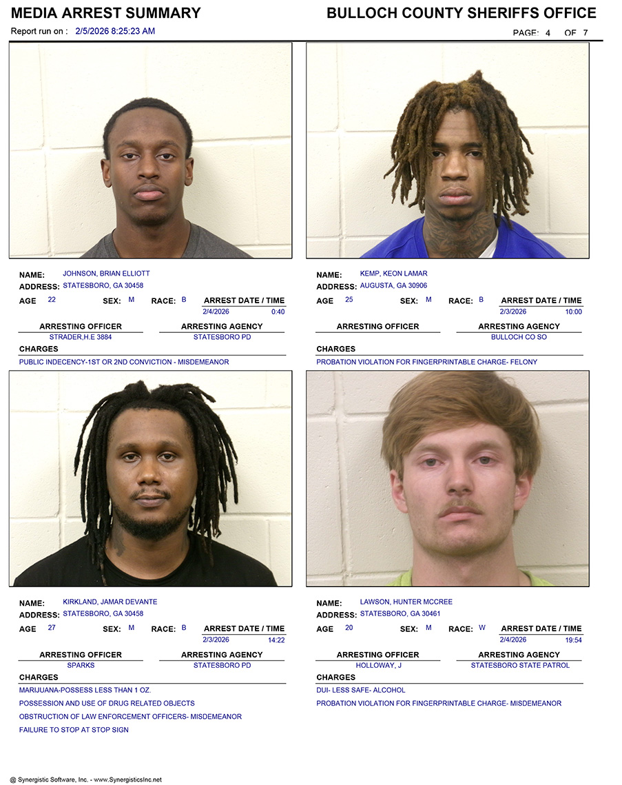 These records are matters of public information provided by the Bulloch County Sheriff’s Office. Booking reports are details of arrests only. All persons below are considered to be innocent unless proven otherwise in a court of law.