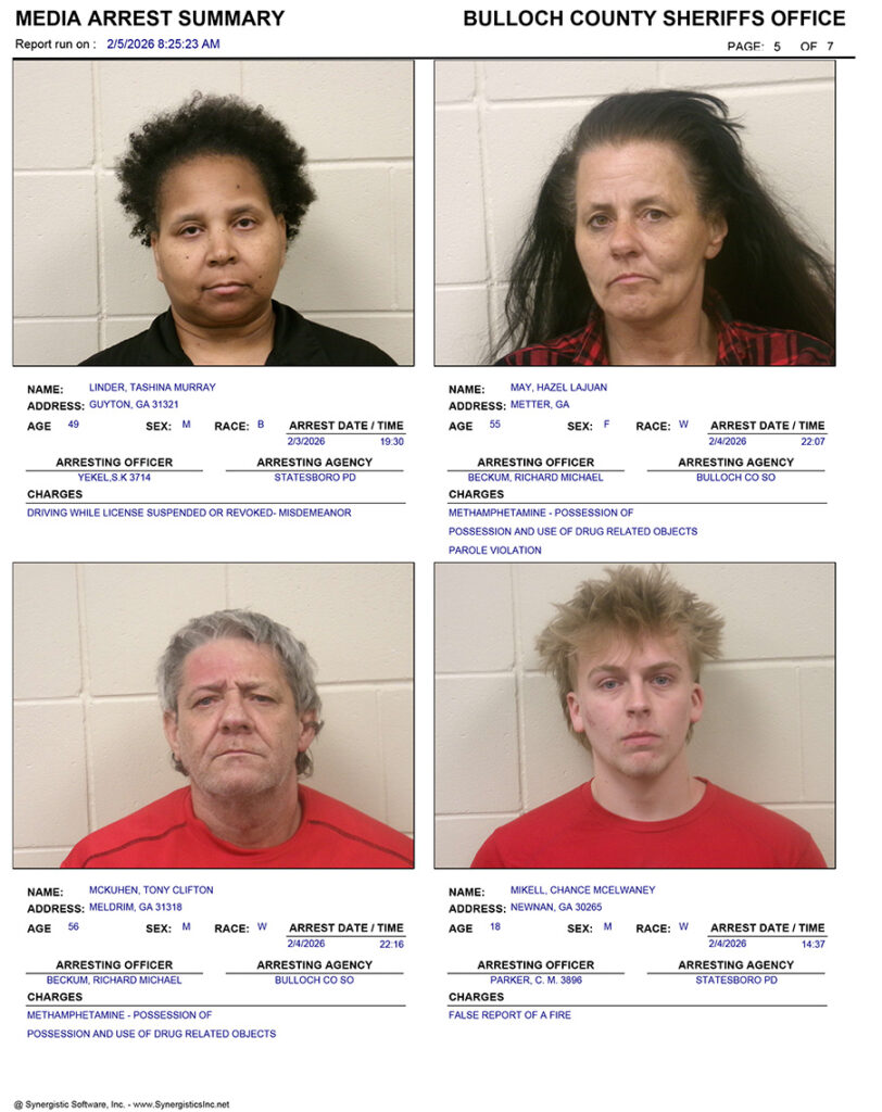 These records are matters of public information provided by the Bulloch County Sheriff’s Office. Booking reports are details of arrests only. All persons below are considered to be innocent unless proven otherwise in a court of law.