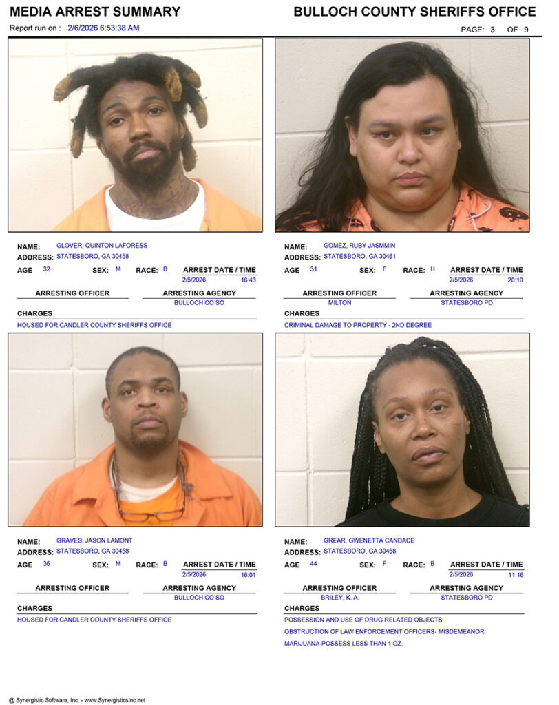 These records are matters of public information provided by the Bulloch County Sheriff’s Office. Booking reports are details of arrests only. All persons below are considered to be innocent unless proven otherwise in a court of law.