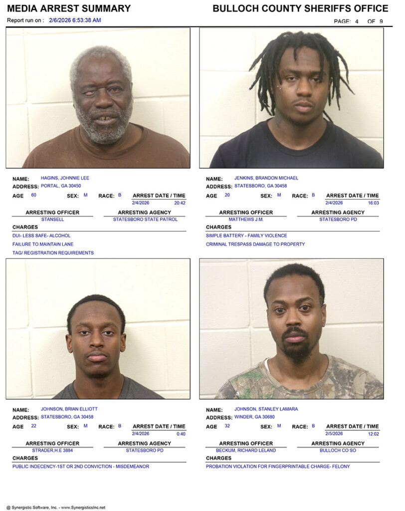 These records are matters of public information provided by the Bulloch County Sheriff’s Office. Booking reports are details of arrests only. All persons below are considered to be innocent unless proven otherwise in a court of law.