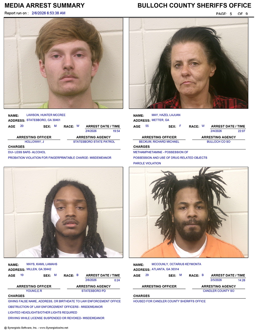 These records are matters of public information provided by the Bulloch County Sheriff’s Office. Booking reports are details of arrests only. All persons below are considered to be innocent unless proven otherwise in a court of law.