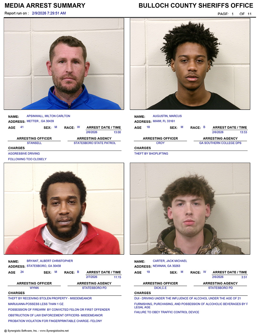 These records are matters of public information provided by the Bulloch County Sheriff’s Office. Booking reports are details of arrests only. All persons below are considered to be innocent unless proven otherwise in a court of law.