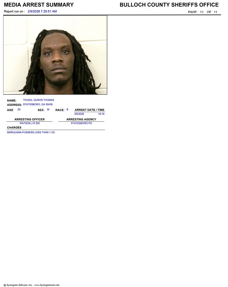 These records are matters of public information provided by the Bulloch County Sheriff’s Office. Booking reports are details of arrests only. All persons below are considered to be innocent unless proven otherwise in a court of law.