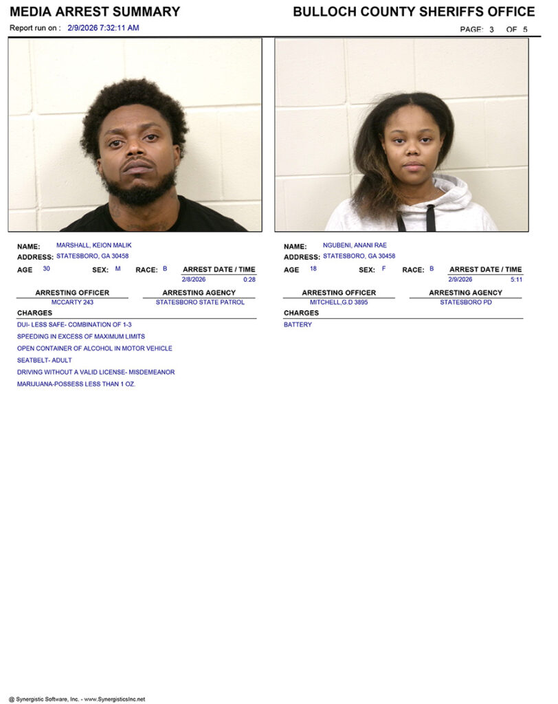 These records are matters of public information provided by the Bulloch County Sheriff’s Office. Booking reports are details of arrests only. All persons below are considered to be innocent unless proven otherwise in a court of law.