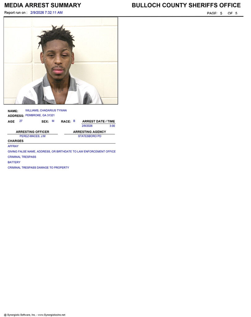 These records are matters of public information provided by the Bulloch County Sheriff’s Office. Booking reports are details of arrests only. All persons below are considered to be innocent unless proven otherwise in a court of law.