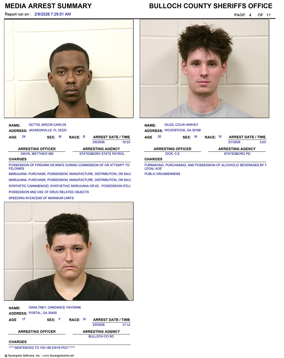 These records are matters of public information provided by the Bulloch County Sheriff’s Office. Booking reports are details of arrests only. All persons below are considered to be innocent unless proven otherwise in a court of law.
