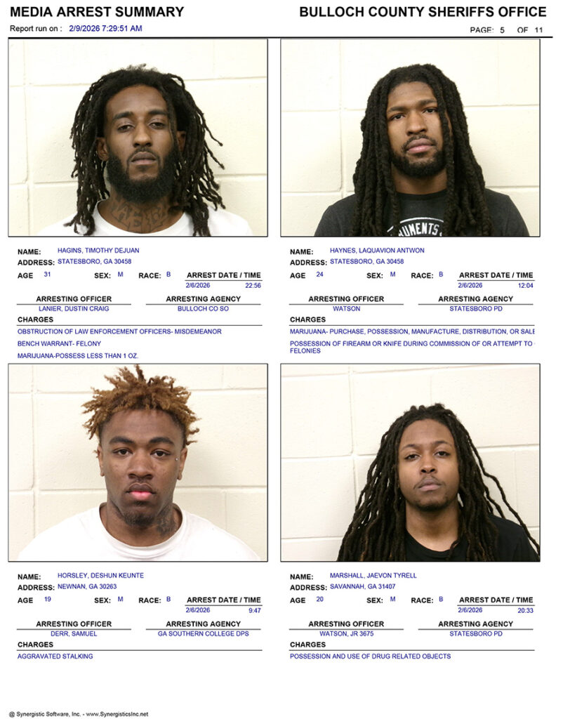 These records are matters of public information provided by the Bulloch County Sheriff’s Office. Booking reports are details of arrests only. All persons below are considered to be innocent unless proven otherwise in a court of law.