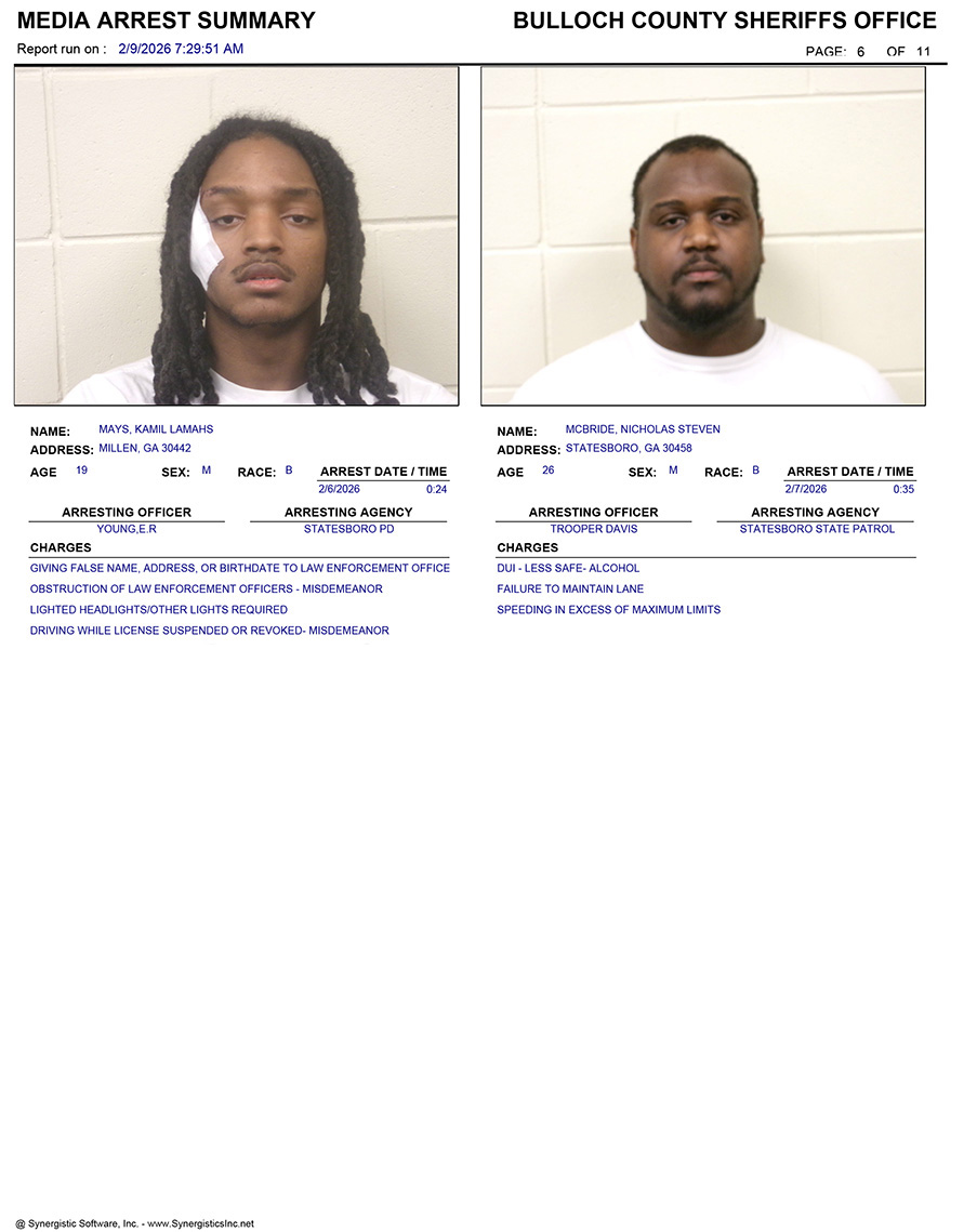 These records are matters of public information provided by the Bulloch County Sheriff’s Office. Booking reports are details of arrests only. All persons below are considered to be innocent unless proven otherwise in a court of law.