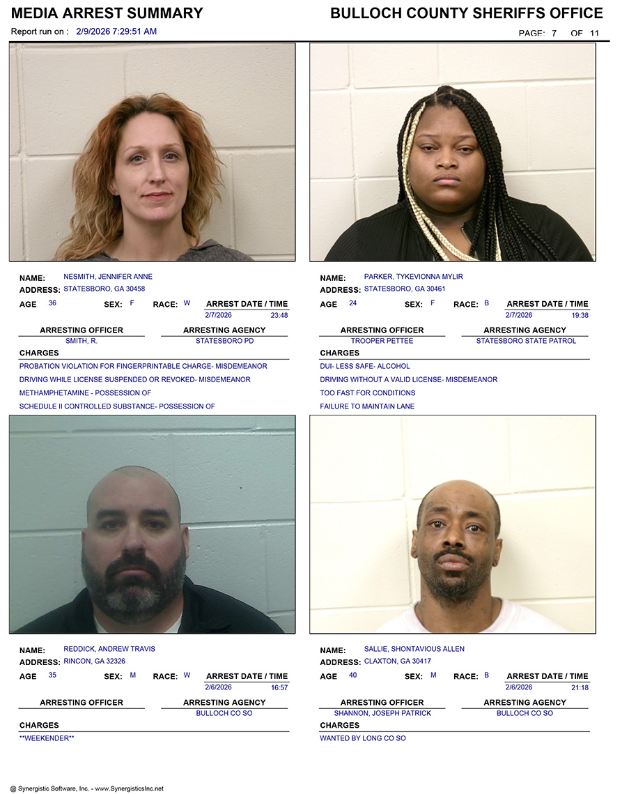These records are matters of public information provided by the Bulloch County Sheriff’s Office. Booking reports are details of arrests only. All persons below are considered to be innocent unless proven otherwise in a court of law.