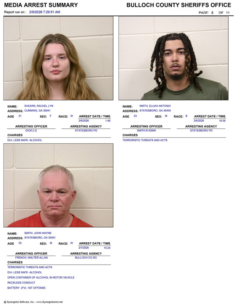 These records are matters of public information provided by the Bulloch County Sheriff’s Office. Booking reports are details of arrests only. All persons below are considered to be innocent unless proven otherwise in a court of law.