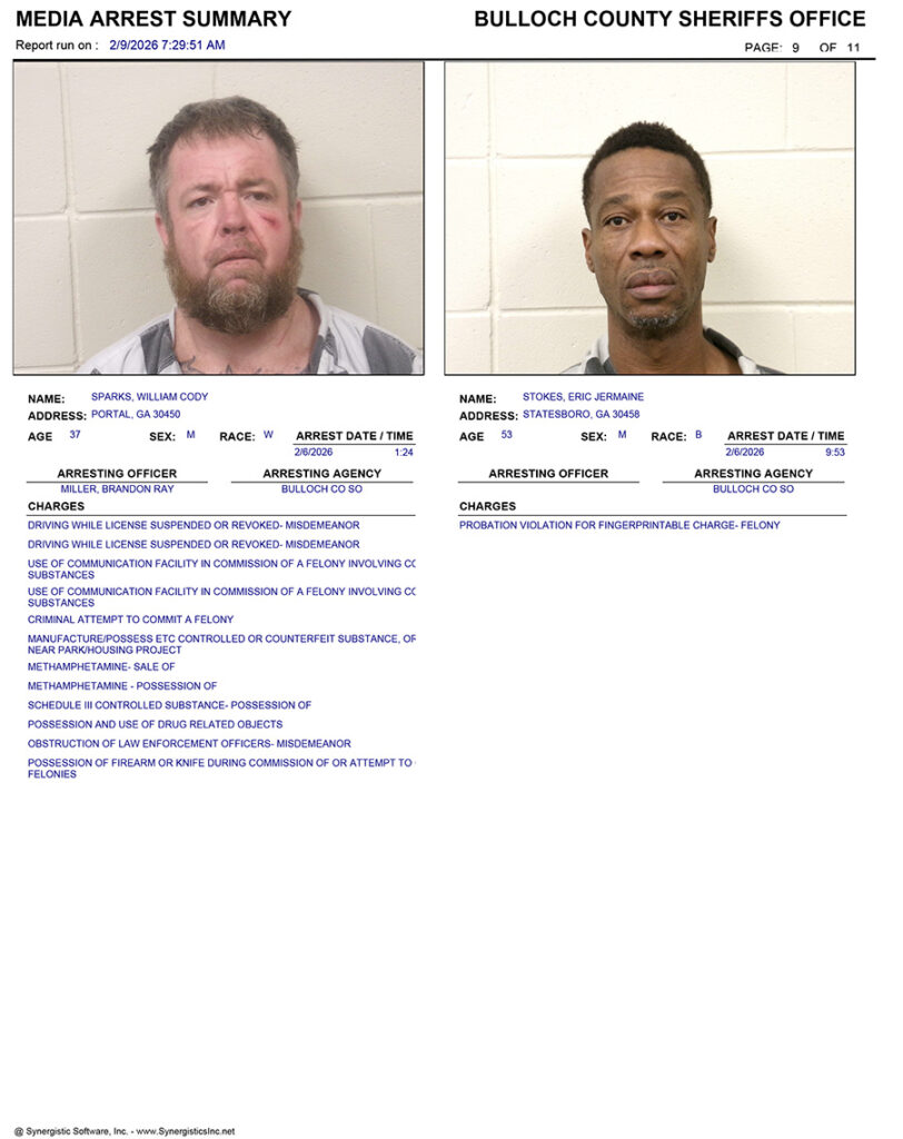 These records are matters of public information provided by the Bulloch County Sheriff’s Office. Booking reports are details of arrests only. All persons below are considered to be innocent unless proven otherwise in a court of law.