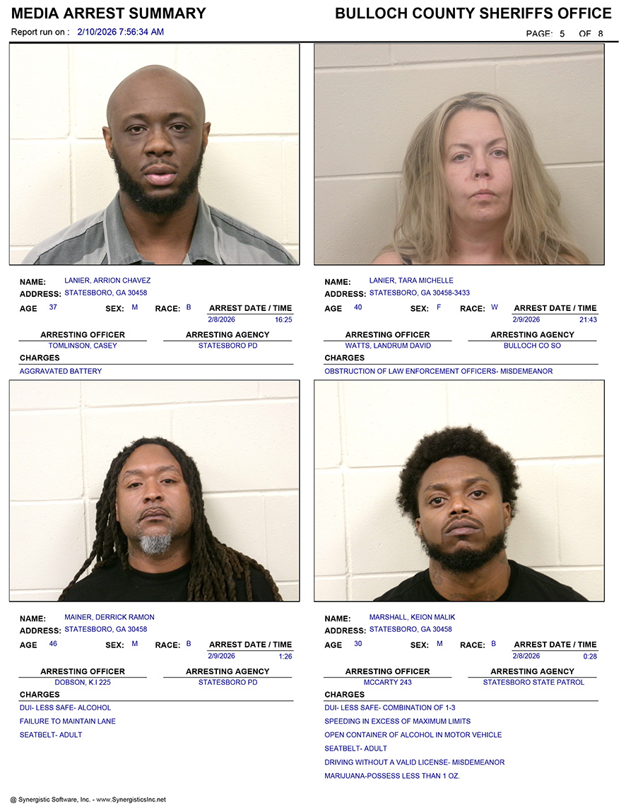 These records are matters of public information provided by the Bulloch County Sheriff’s Office. Booking reports are details of arrests only. All persons below are considered to be innocent unless proven otherwise in a court of law.