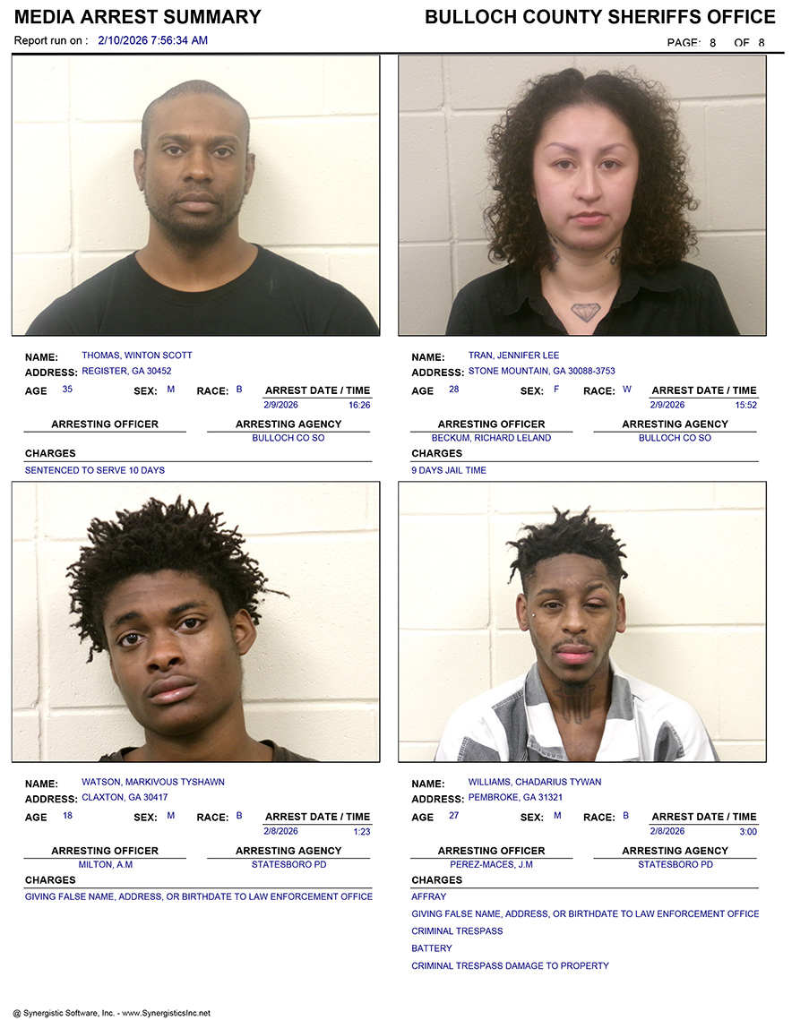 These records are matters of public information provided by the Bulloch County Sheriff’s Office. Booking reports are details of arrests only. All persons below are considered to be innocent unless proven otherwise in a court of law.