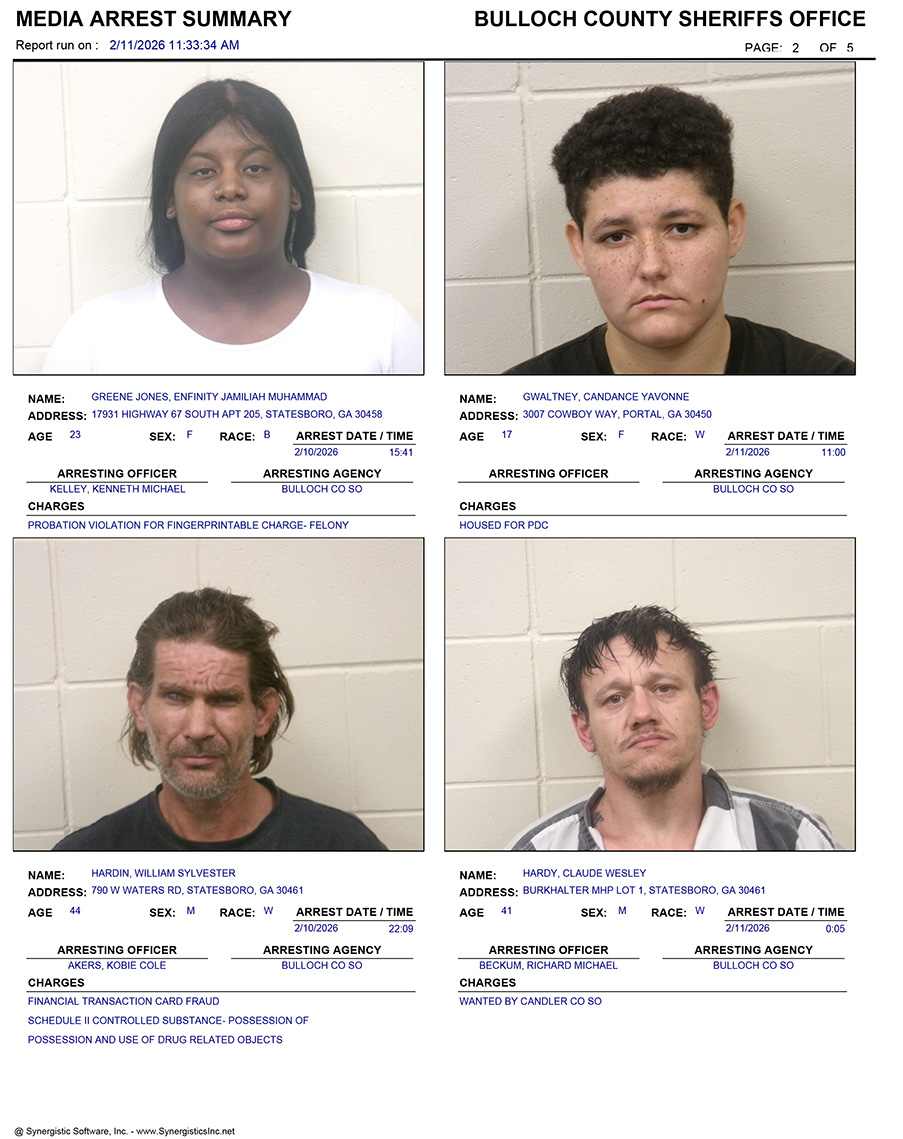 These records are matters of public information provided by the Bulloch County Sheriff’s Office. Booking reports are details of arrests only. All persons below are considered to be innocent unless proven otherwise in a court of law.