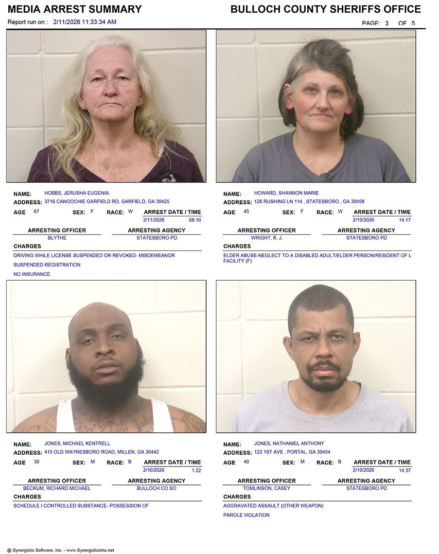 These records are matters of public information provided by the Bulloch County Sheriff’s Office. Booking reports are details of arrests only. All persons below are considered to be innocent unless proven otherwise in a court of law.