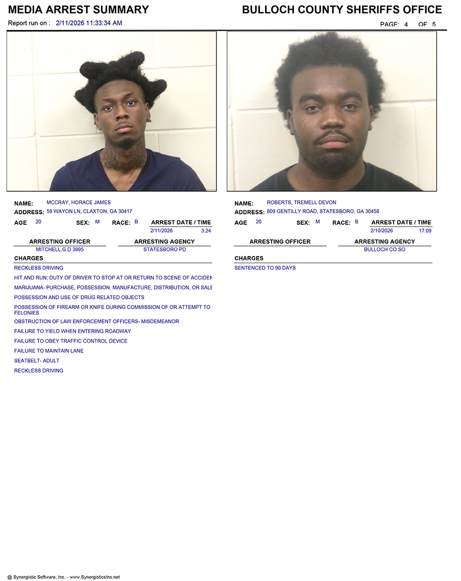 These records are matters of public information provided by the Bulloch County Sheriff’s Office. Booking reports are details of arrests only. All persons below are considered to be innocent unless proven otherwise in a court of law.