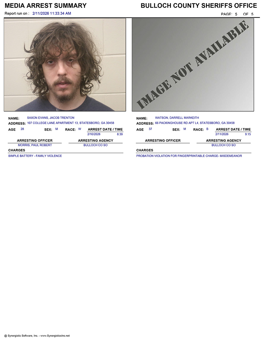 These records are matters of public information provided by the Bulloch County Sheriff’s Office. Booking reports are details of arrests only. All persons below are considered to be innocent unless proven otherwise in a court of law.