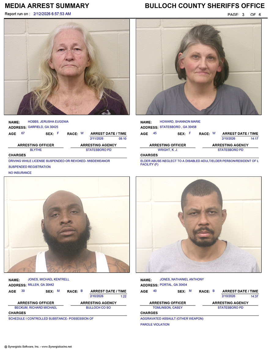 These records are matters of public information provided by the Bulloch County Sheriff’s Office. Booking reports are details of arrests only. All persons below are considered to be innocent unless proven otherwise in a court of law.