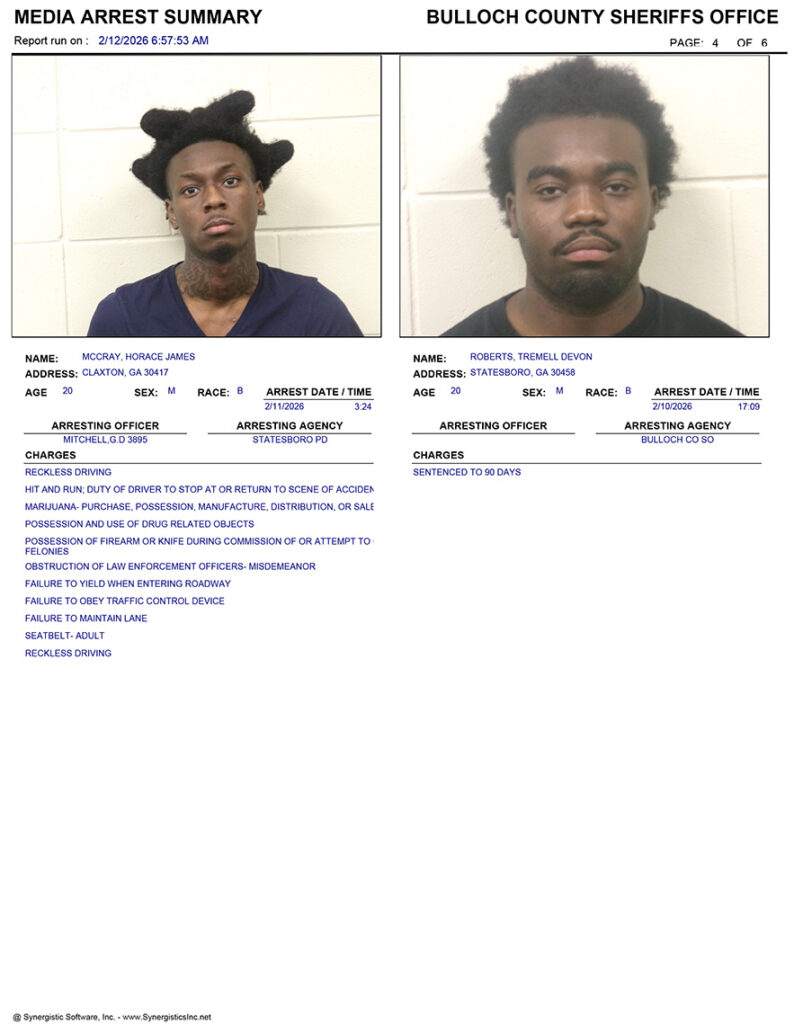 These records are matters of public information provided by the Bulloch County Sheriff’s Office. Booking reports are details of arrests only. All persons below are considered to be innocent unless proven otherwise in a court of law.