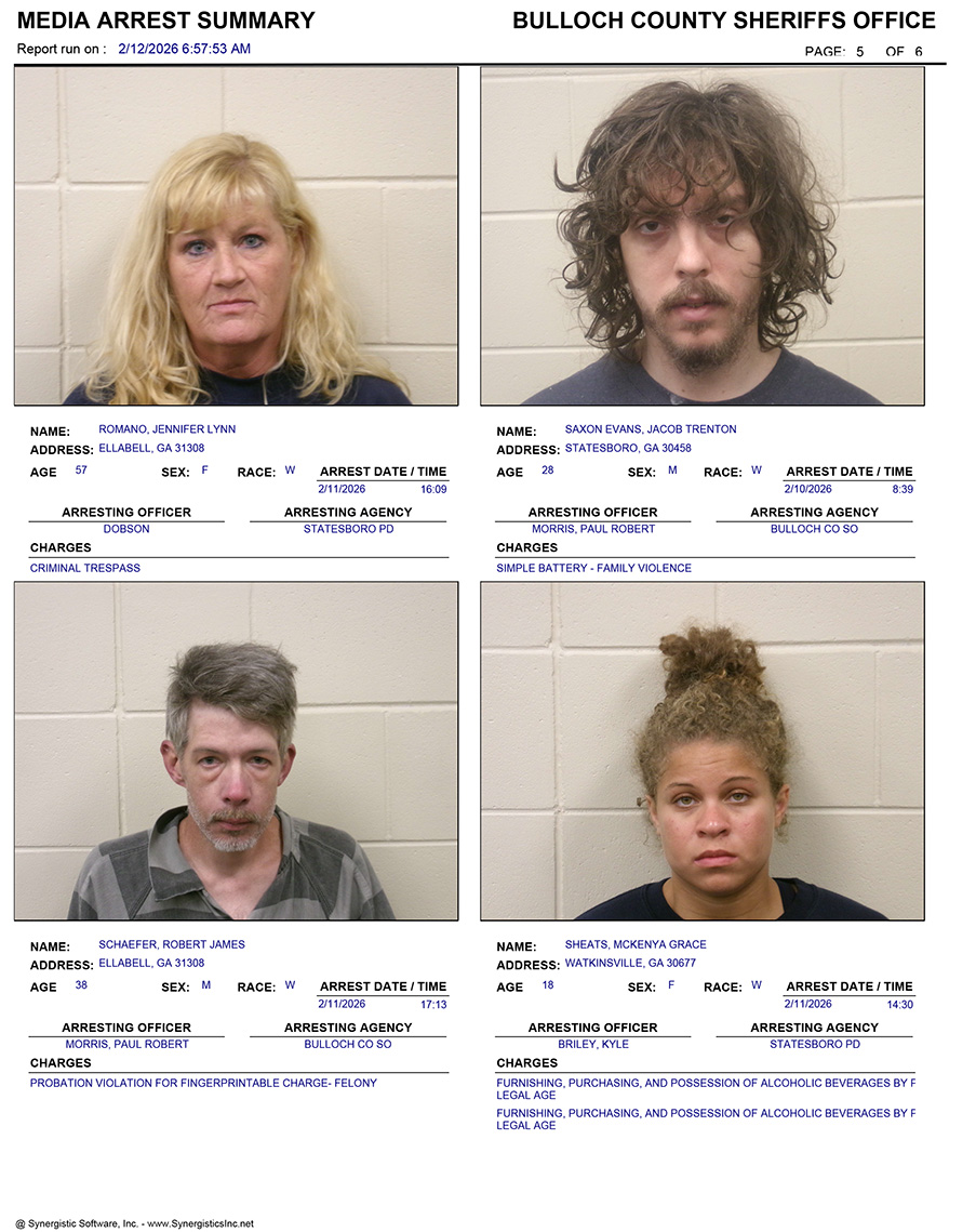 These records are matters of public information provided by the Bulloch County Sheriff’s Office. Booking reports are details of arrests only. All persons below are considered to be innocent unless proven otherwise in a court of law.
