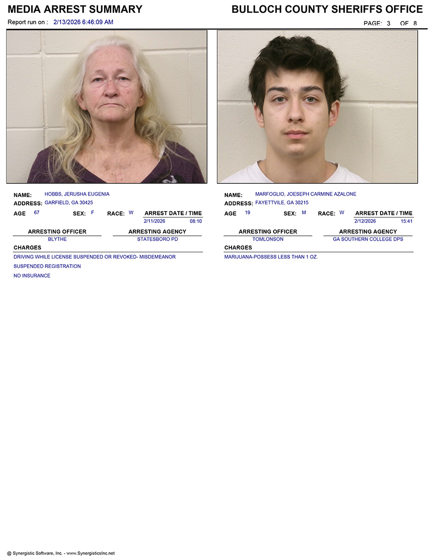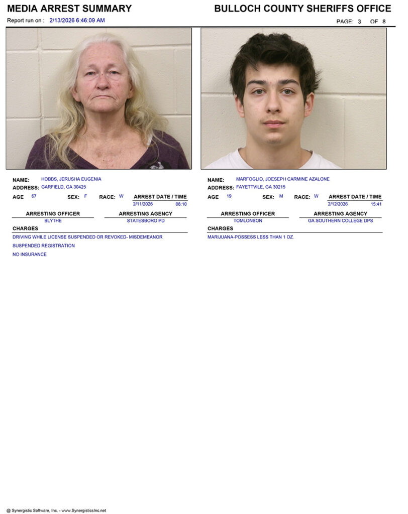 These records are matters of public information provided by the Bulloch County Sheriff’s Office. Booking reports are details of arrests only. All persons below are considered to be innocent unless proven otherwise in a court of law.