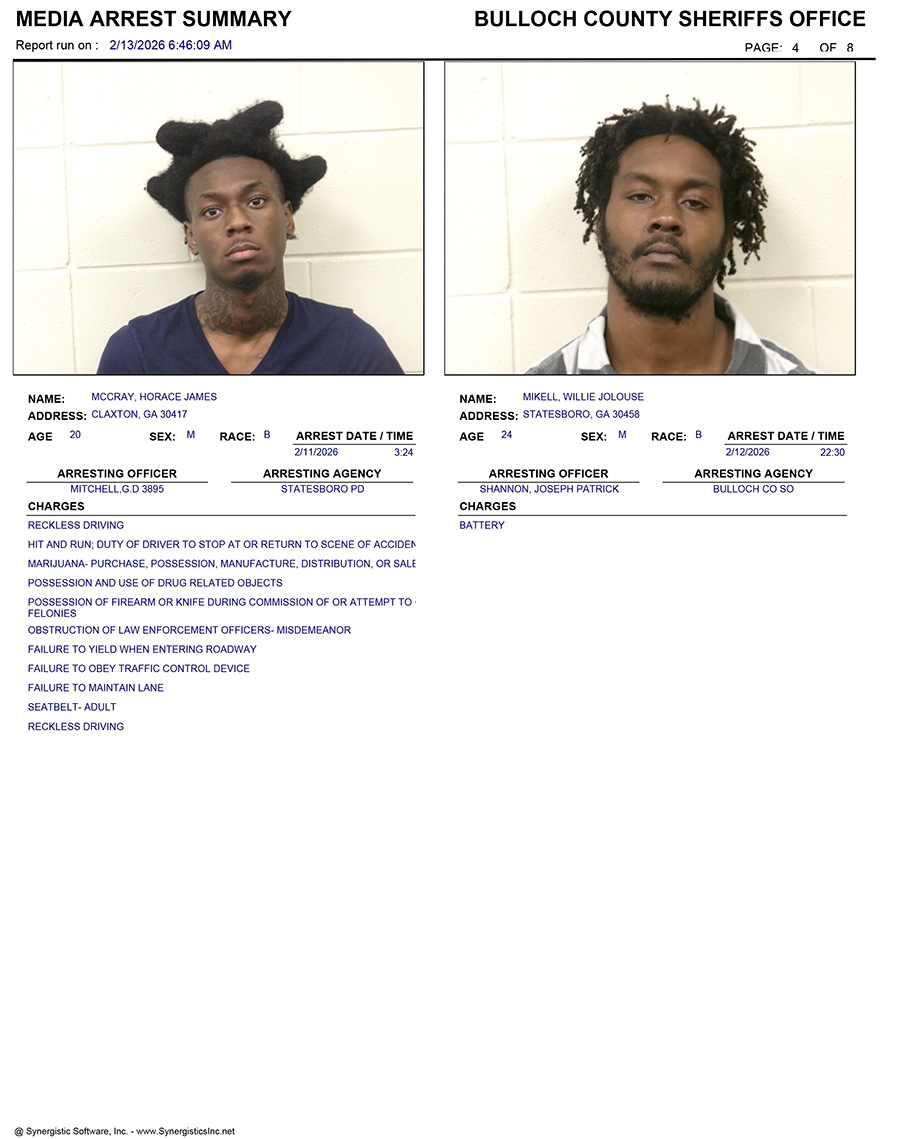These records are matters of public information provided by the Bulloch County Sheriff’s Office. Booking reports are details of arrests only. All persons below are considered to be innocent unless proven otherwise in a court of law.