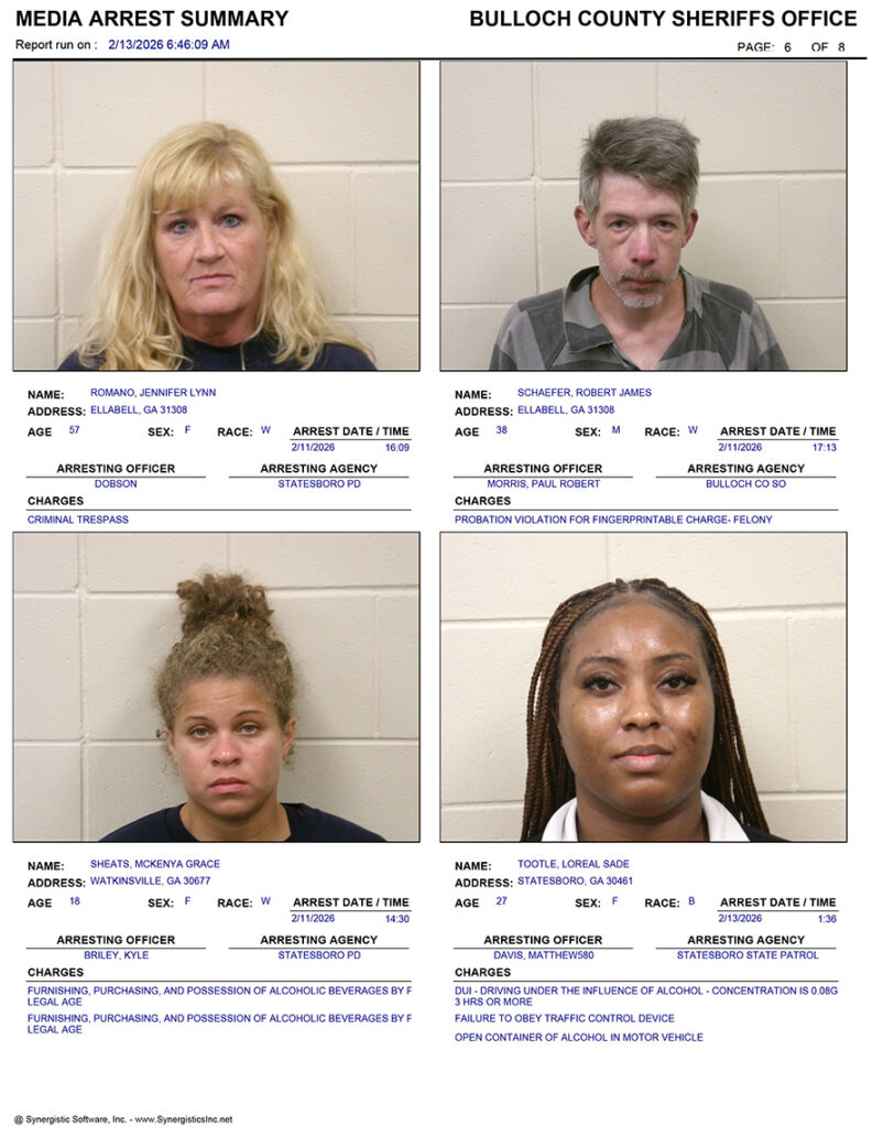 These records are matters of public information provided by the Bulloch County Sheriff’s Office. Booking reports are details of arrests only. All persons below are considered to be innocent unless proven otherwise in a court of law.