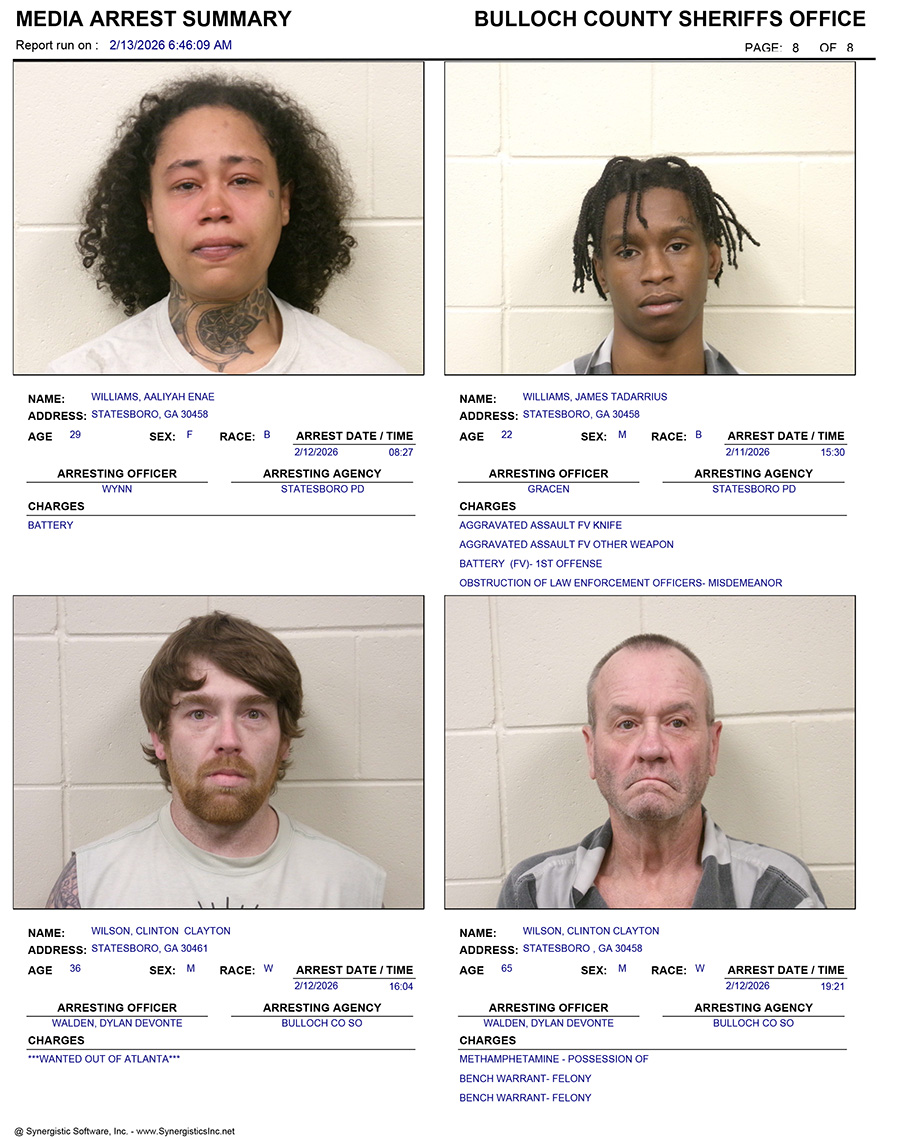 These records are matters of public information provided by the Bulloch County Sheriff’s Office. Booking reports are details of arrests only. All persons below are considered to be innocent unless proven otherwise in a court of law.