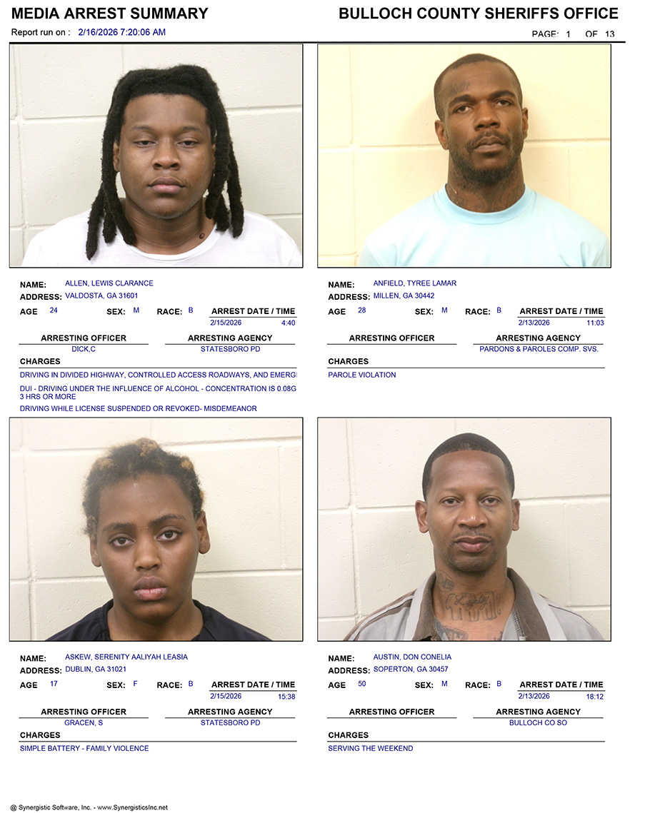These records are matters of public information provided by the Bulloch County Sheriff’s Office. Booking reports are details of arrests only. All persons below are considered to be innocent unless proven otherwise in a court of law.
