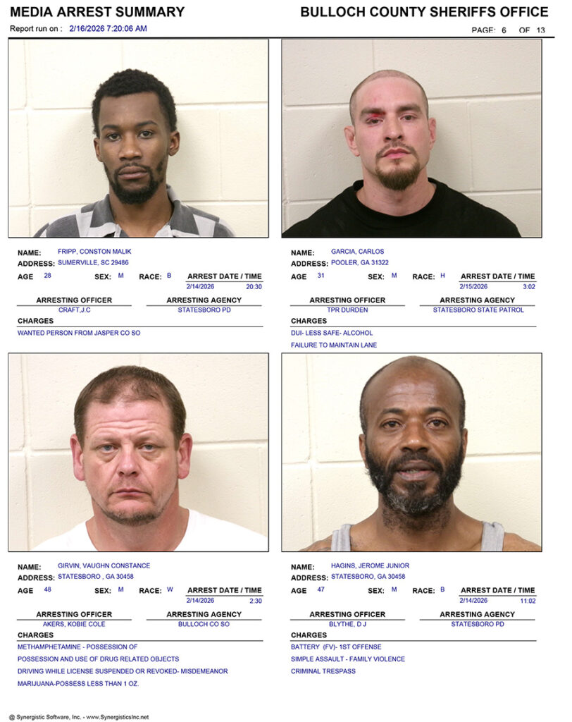 These records are matters of public information provided by the Bulloch County Sheriff’s Office. Booking reports are details of arrests only. All persons below are considered to be innocent unless proven otherwise in a court of law.