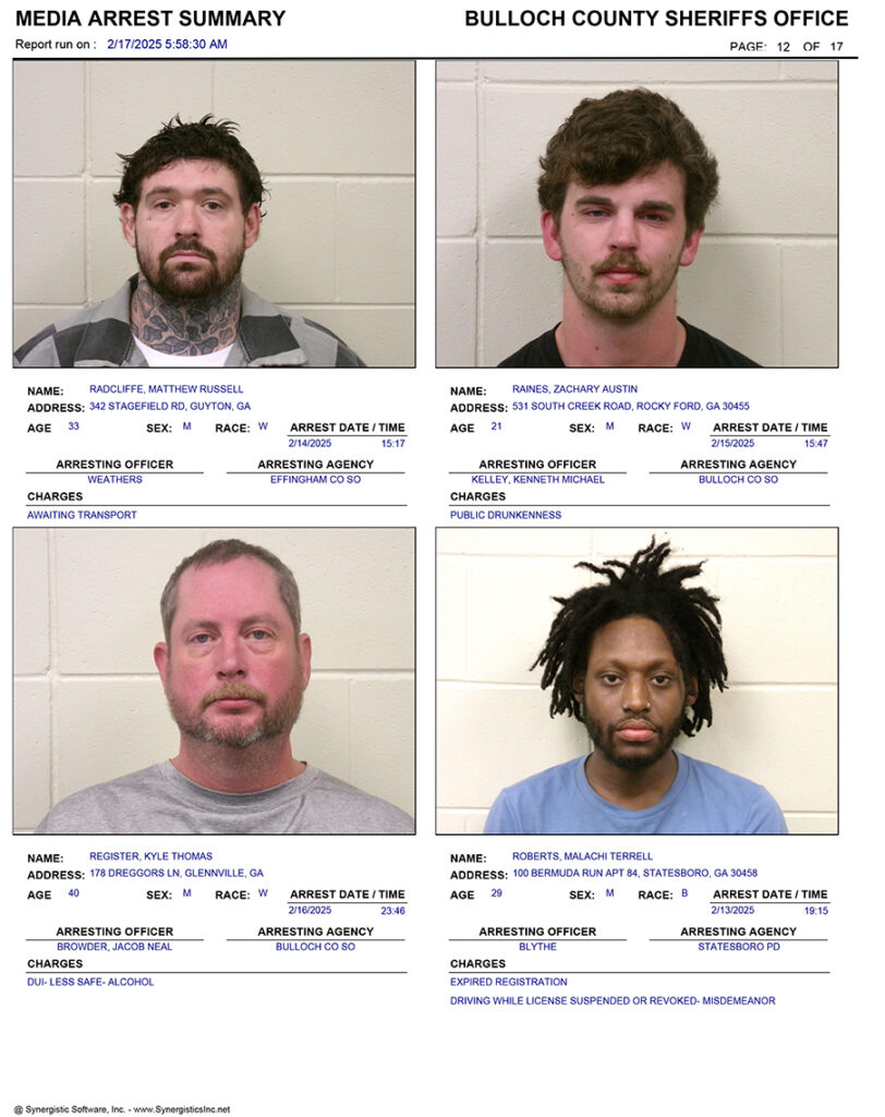 These records are matters of public information provided by the Bulloch County Sheriff’s Office. Booking reports are details of arrests only. All persons below are considered to be innocent unless proven otherwise in a court of law.