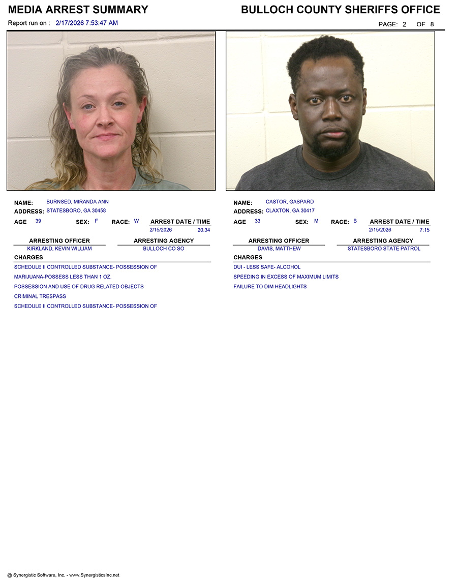 These records are matters of public information provided by the Bulloch County Sheriff’s Office. Booking reports are details of arrests only. All persons below are considered to be innocent unless proven otherwise in a court of law.