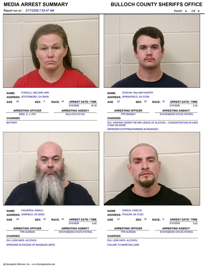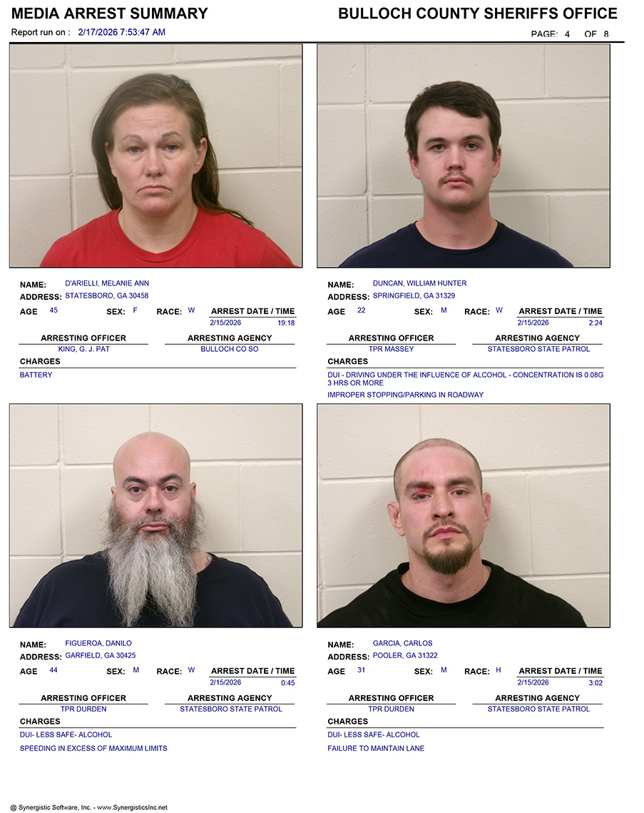 These records are matters of public information provided by the Bulloch County Sheriff’s Office. Booking reports are details of arrests only. All persons below are considered to be innocent unless proven otherwise in a court of law.