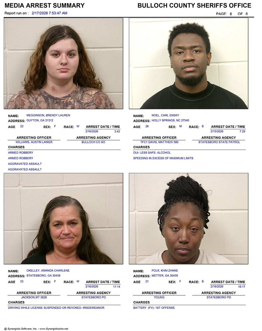 These records are matters of public information provided by the Bulloch County Sheriff’s Office. Booking reports are details of arrests only. All persons below are considered to be innocent unless proven otherwise in a court of law.