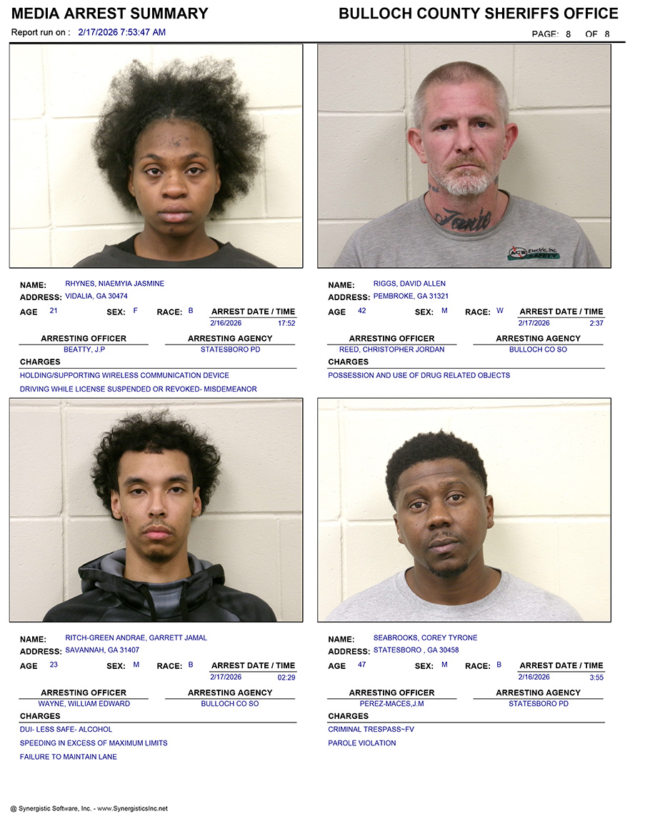 These records are matters of public information provided by the Bulloch County Sheriff’s Office. Booking reports are details of arrests only. All persons below are considered to be innocent unless proven otherwise in a court of law.
