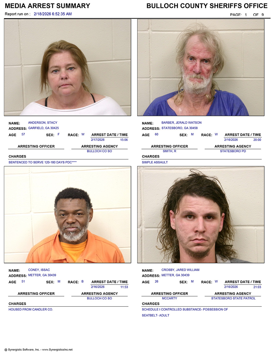 These records are matters of public information provided by the Bulloch County Sheriff’s Office. Booking reports are details of arrests only. All persons below are considered to be innocent unless proven otherwise in a court of law.