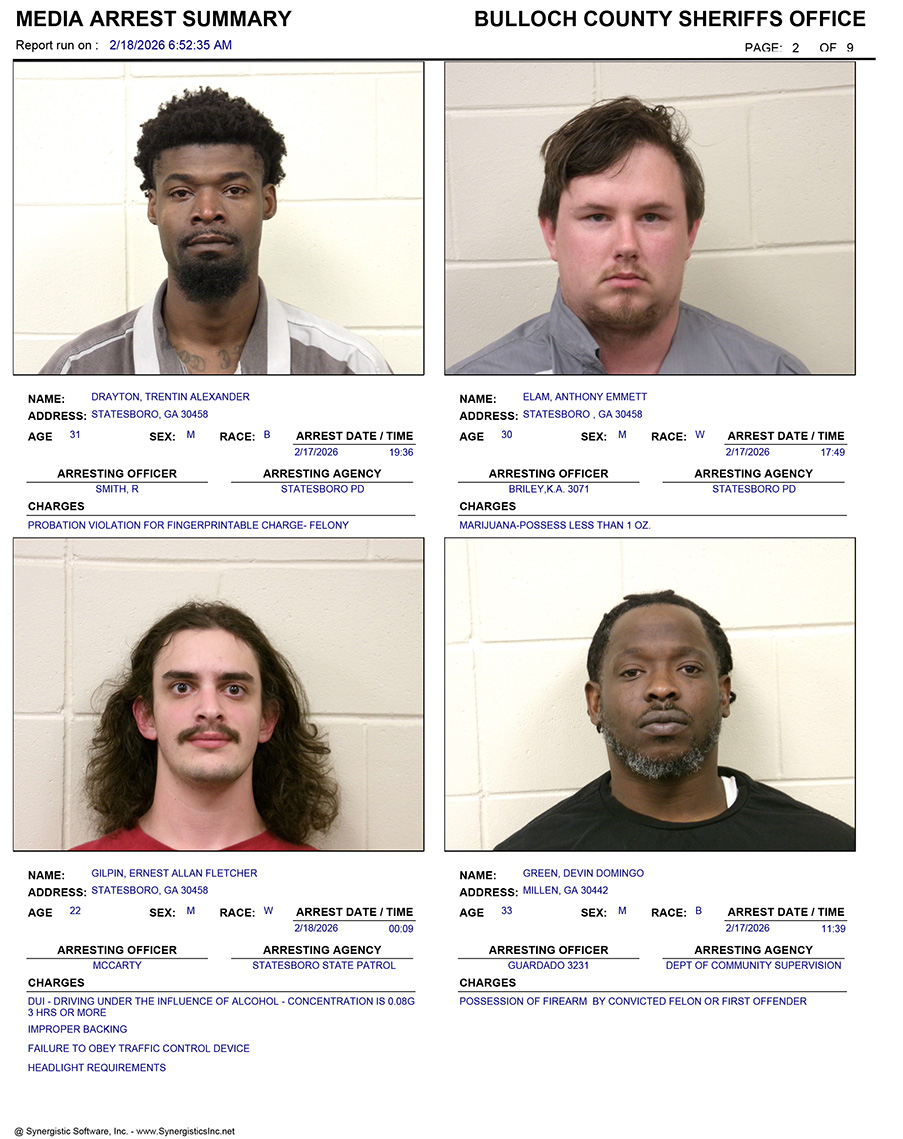 These records are matters of public information provided by the Bulloch County Sheriff’s Office. Booking reports are details of arrests only. All persons below are considered to be innocent unless proven otherwise in a court of law.