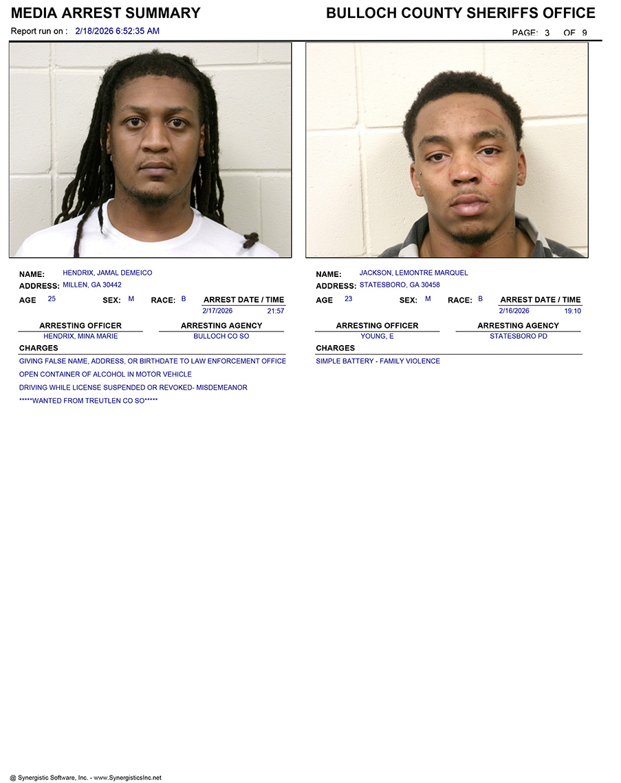 These records are matters of public information provided by the Bulloch County Sheriff’s Office. Booking reports are details of arrests only. All persons below are considered to be innocent unless proven otherwise in a court of law.