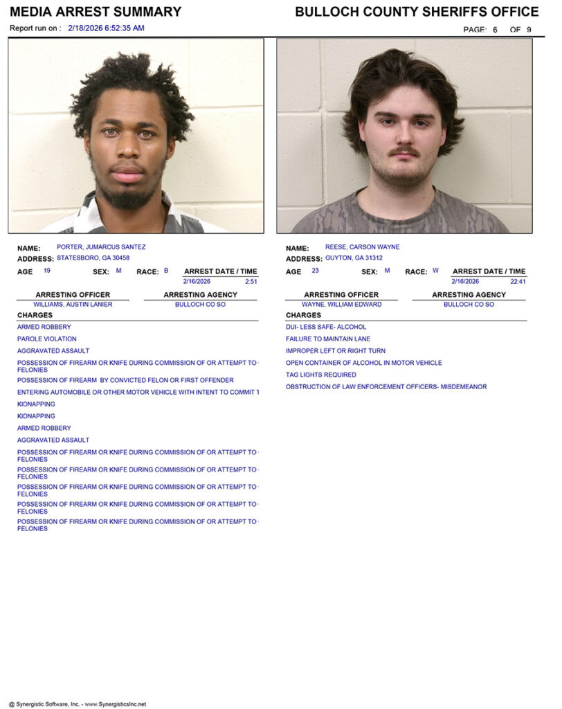 These records are matters of public information provided by the Bulloch County Sheriff’s Office. Booking reports are details of arrests only. All persons below are considered to be innocent unless proven otherwise in a court of law.
