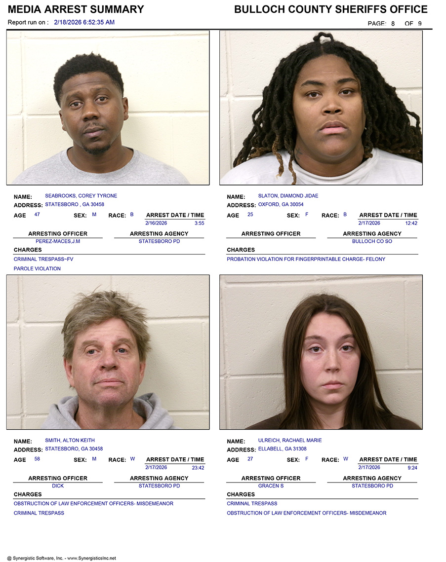 These records are matters of public information provided by the Bulloch County Sheriff’s Office. Booking reports are details of arrests only. All persons below are considered to be innocent unless proven otherwise in a court of law.