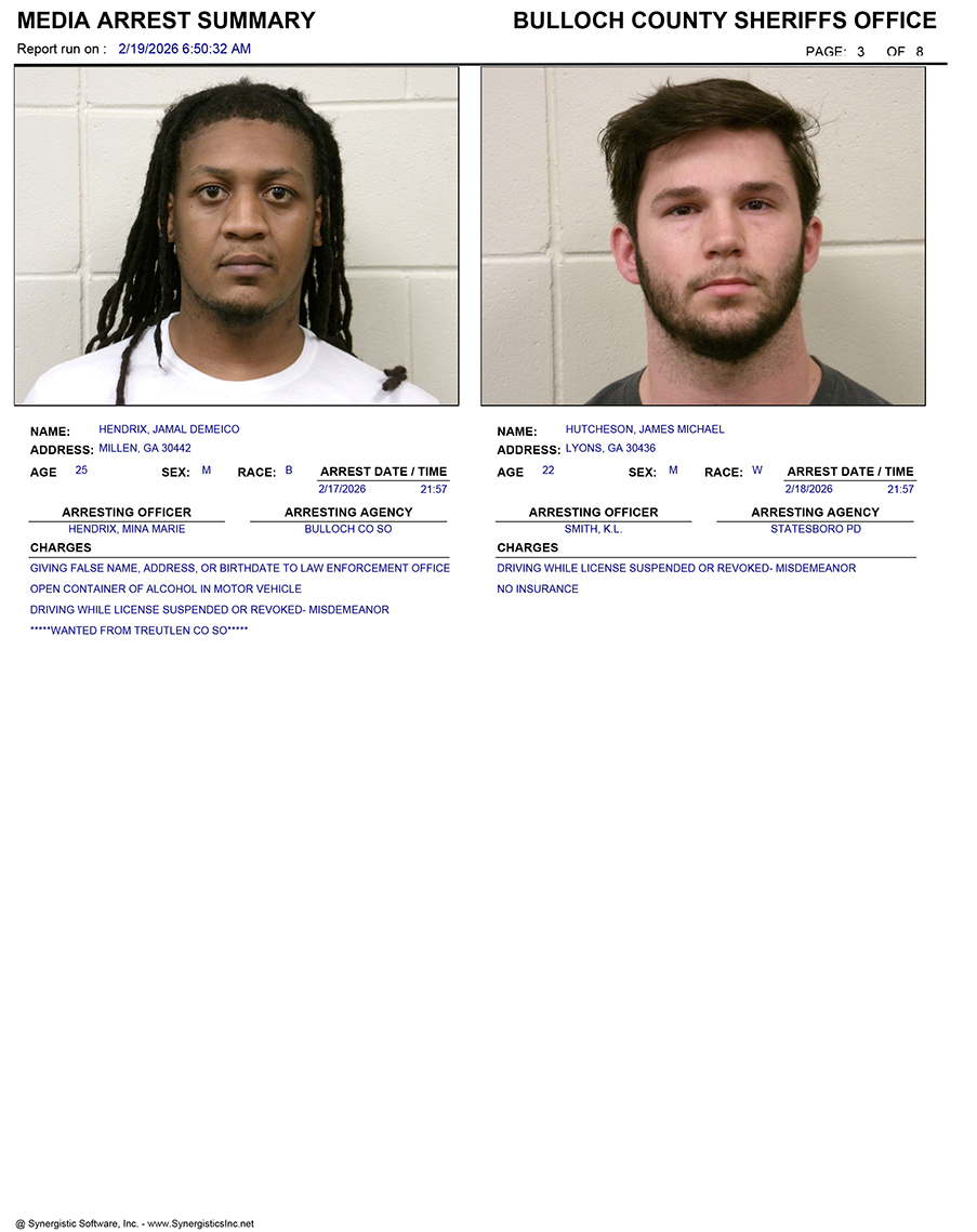 These records are matters of public information provided by the Bulloch County Sheriff’s Office. Booking reports are details of arrests only. All persons below are considered to be innocent unless proven otherwise in a court of law.
