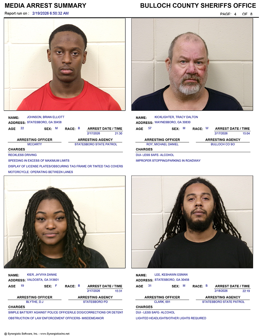 These records are matters of public information provided by the Bulloch County Sheriff’s Office. Booking reports are details of arrests only. All persons below are considered to be innocent unless proven otherwise in a court of law.
